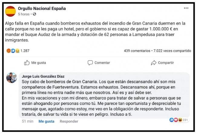 El comentario de la página: «Algo falla en España cuando bomberos exhaustos del incendio de Gran Canaria duermen en la calle porque no se les paga un hotel pero el gobierno sí es capaz de gastar 1.000.000 de euros en mandar el buque ‘Audaz’ de la armada y dotación de 62 personas a Lampedusa para traer inmigrantes».