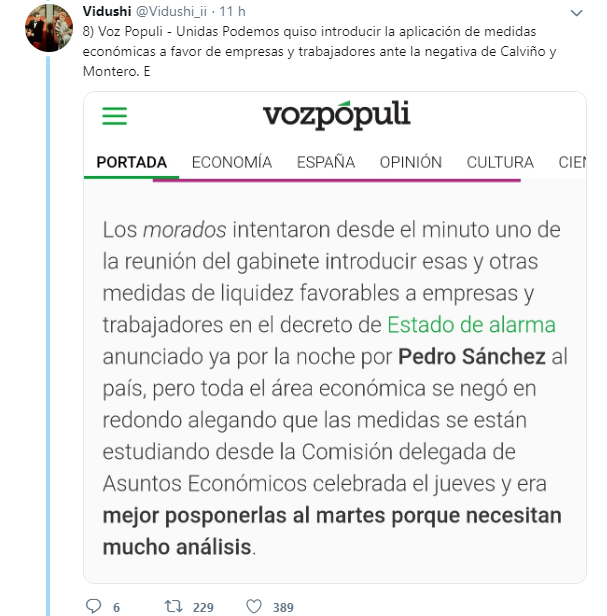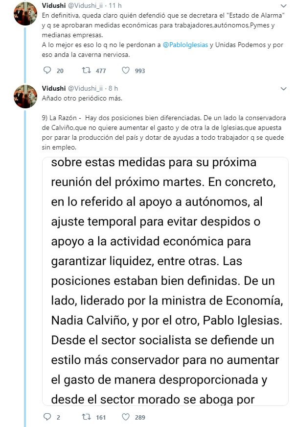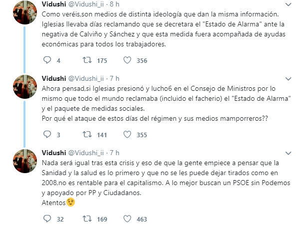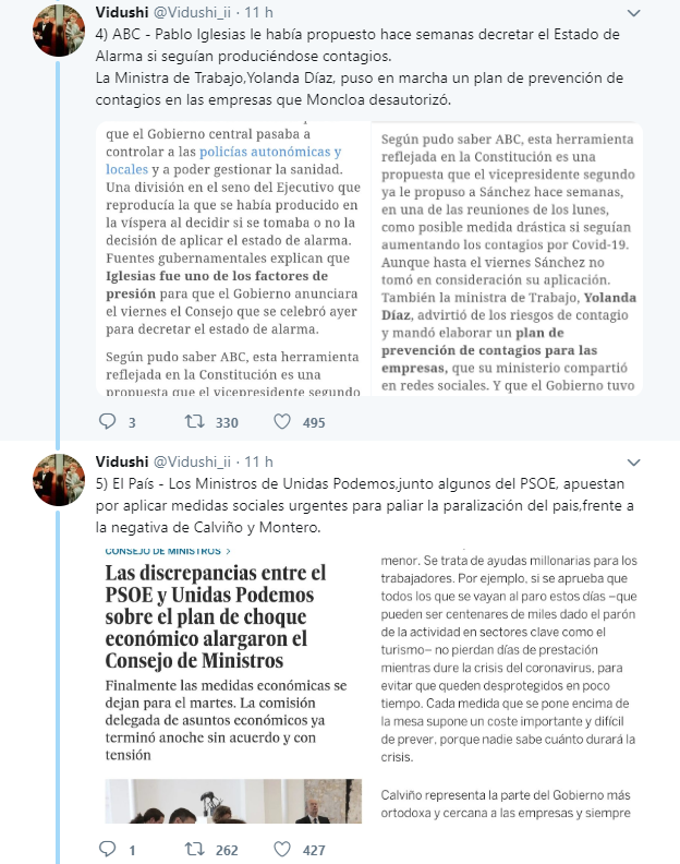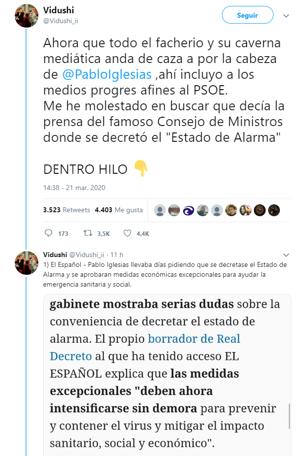 El usuario de Twitter @Vidushi_ii, ha elaborado un hilo cronológico para contrarrestar los ataques de la derecha contra Pablo Iglesias, en el que desgrana como el líder de Podemos y su ministra de Trabajo se anticiparon al Gobierno en la aplicación de las medidas de protección frente al virus.