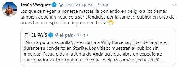 Al igual que otros presentadores y cantantes, Jesús Vázquez opinó sobre la conducta del vocalista del grupo, que animó al público a no llevar mascarillas con la frase: «¡Ni una puta mascarilla!».