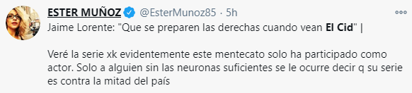 Una de las personas más criticas con el actor ha sido Esther Muñoz, la que apuntaba a icono pop del PP hasta que perdió su escaño en las últimas elecciones, y que fue recolocada en la junta de Castilla y León con un sueldo de 42.000 euros al año.