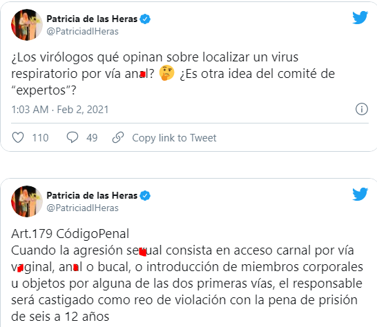 El mensaje en su cuenta de Twitter se hacía eco del artículo 179 del Código Penal. «Cuando la agresión se*ual consista en acceso carnal por vía v*ginal, an*l o bucal, o introducción de miembros corporales u objetos por alguna de las dos primeras vías, el responsable será castigado como reo de vi0lación con la pena de prisión de seis a 12 años».