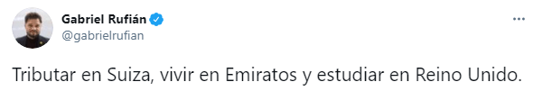 A través de Twitter el diputado independentista expresó que: “Tributar en Suiza, vivir en Emiratos y estudiar en Reino Unido”.