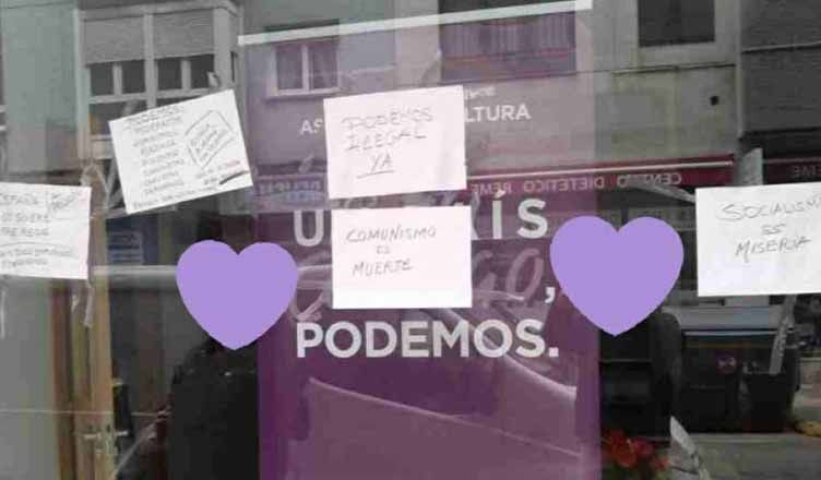 En los carteles figuraban palabras como «ped3rastras», «violentos», y expresiones como «Podemos ilegal ya», «España acabará con vosotros, no os quepa duda».