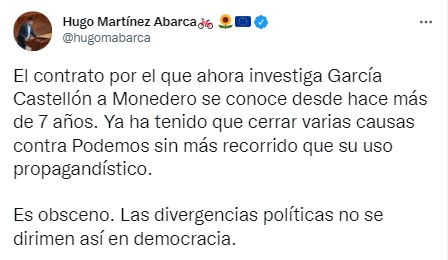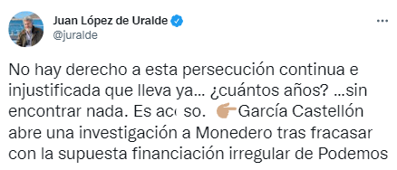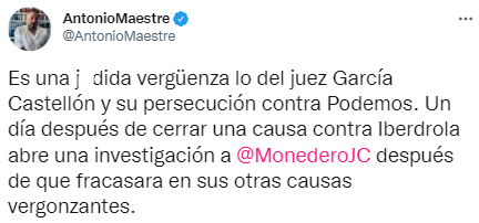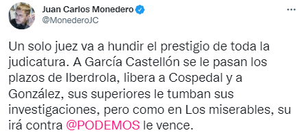 Monedero se ha pronunciado: «Un solo juez va a hundir el prestigio de toda la judicatura. A García Castellón se le pasan los plazos de Iberdrola, libera a Cospedal y a González, sus superiores le tumban sus investigaciones, pero como en Los miserables, su irá contra Podemos le vence».