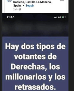 En la imagen, ya eliminada, figuraba el texto: «hay dos tipos de votantes de derechas, los millonarios y los retrasados».